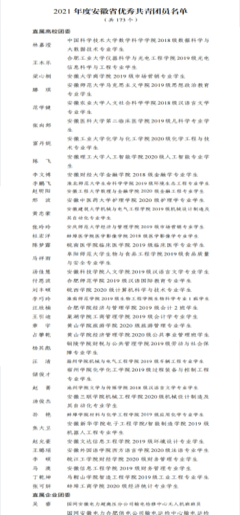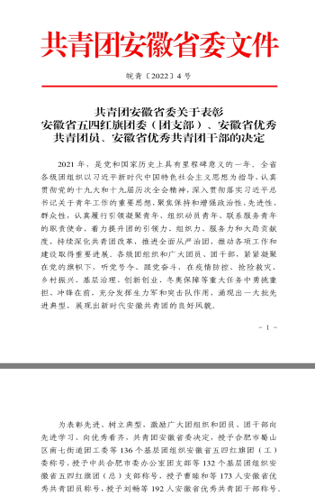 为表彰先进、树立典型,激励广大团组织和团员、团干部向先进学习、向优秀看齐,近期,共青团安徽省委表彰了2021年度安徽省五四红旗团委(团支部)、安徽省优秀共青团、安徽省优秀共青团干部,今年会电气信息工程学院2019级通信工程专业1班团支部获评“安徽省五四红旗团支部”称号、财经学院2020级财务管理专业学生李硕获评“安徽省优秀共青团员”称号。