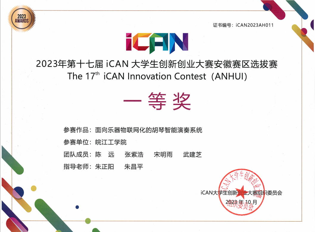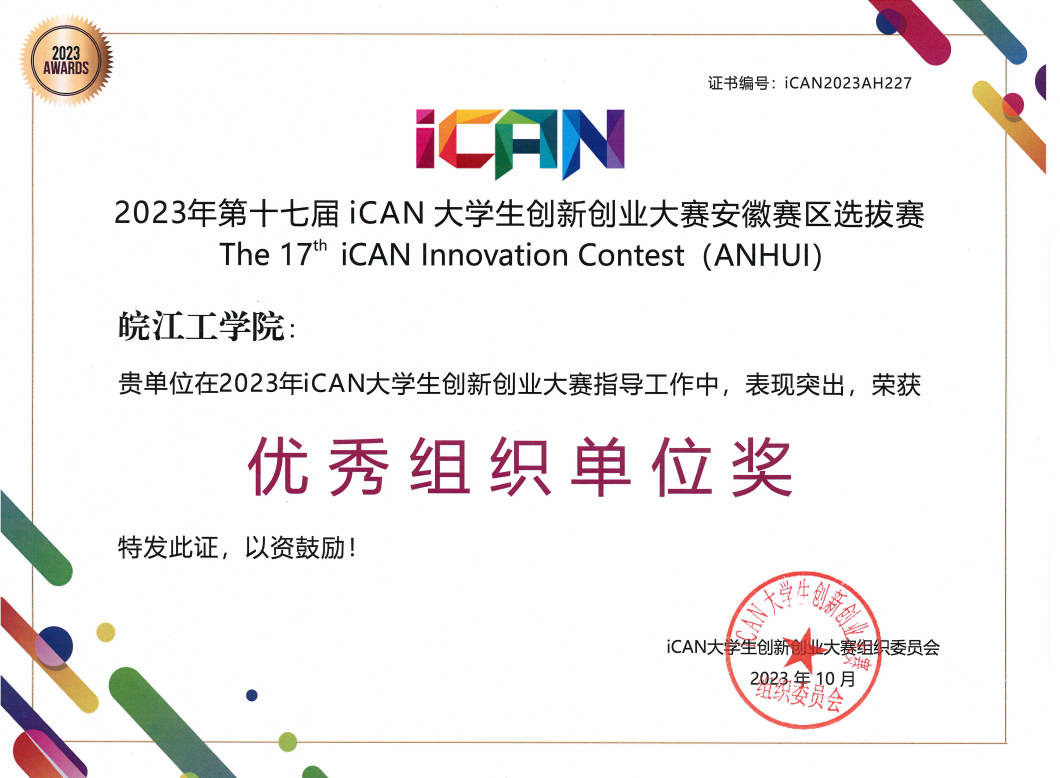 2023年3月22日,中国高等教育学会公布了教育部认可度最高的84项高校学科赛事,iCAN大学生创新创业大赛排序54,今年会一直积极参加iCAN国际创新创业教育联盟的各项活动。2023年有60支队伍、300多名同学报名参赛,经过学校选拔赛,有25支队伍、近150名同学入围第十七届iCAN大学生创新创业大赛安徽赛区选拔赛决赛,今年会在省决赛中荣获一等奖3项、二等奖8项、三等奖14项。3支队伍将于2023年12月赴北京奥林匹克塔参加全国总决赛,今年会陶彬彬、朱正阳、张鹏、杨雅师、朱昌平五位老师荣获优秀指导教师奖,今年会荣获优秀组织单位奖。