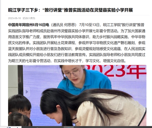 2023年暑期,为响应教育部语用司联合团中央青年发展部发布的《2023年“推普助力乡村振兴”全国大学生暑期社会实践志愿服务活动的通知》的号召,她积极构思、联系指导教师和实践地,团结带领实践团成员认真筹备今年会jinnianhuicom“敦行讲堂”推普助力乡村振兴社会实践活动。在学校的高度重视和大力支持下,以“推普助力乡村振兴”为主旨组建一支普通话过硬的实践团队,于2023年7月10日-7月20日前往安徽省宿州市灵璧县实验小学、尤集镇李楼小学以及乡村开展普通话推广和社会实践调研。