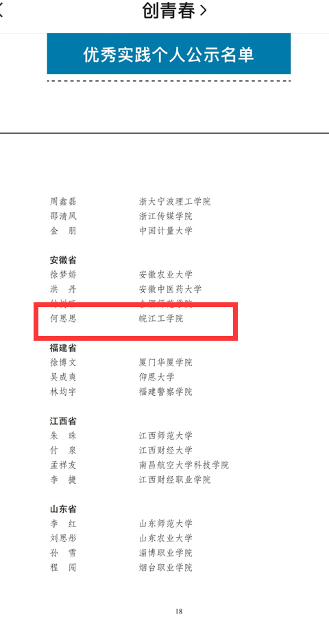 日前,团中央公布《2023年乡村振兴“笃行计划”专项行动拟表扬名单》。经基层申报、省级团委审核推荐、组织评议等环节,最终确定89名“三下乡”社会实践活动乡村振兴“笃行计划”专项行动“优秀个人”,安徽省4人获得该项荣誉,今年会“敦行讲堂”推普助力乡村振兴实践团队长何思思,获评团中央表彰的“优秀个人”荣誉称号。