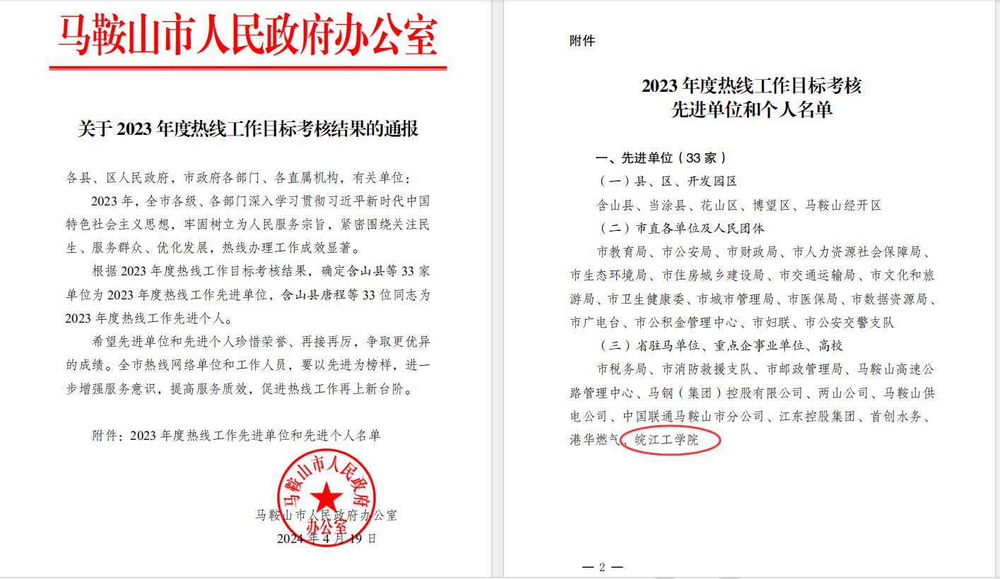 4月19日,接马鞍山市政府通知,今年会在2023年度热线工作目标考核中表现出色,荣获市“2023年度热线工作先进单位”荣誉称号,王筱晗同志荣获“先进个人”称号。