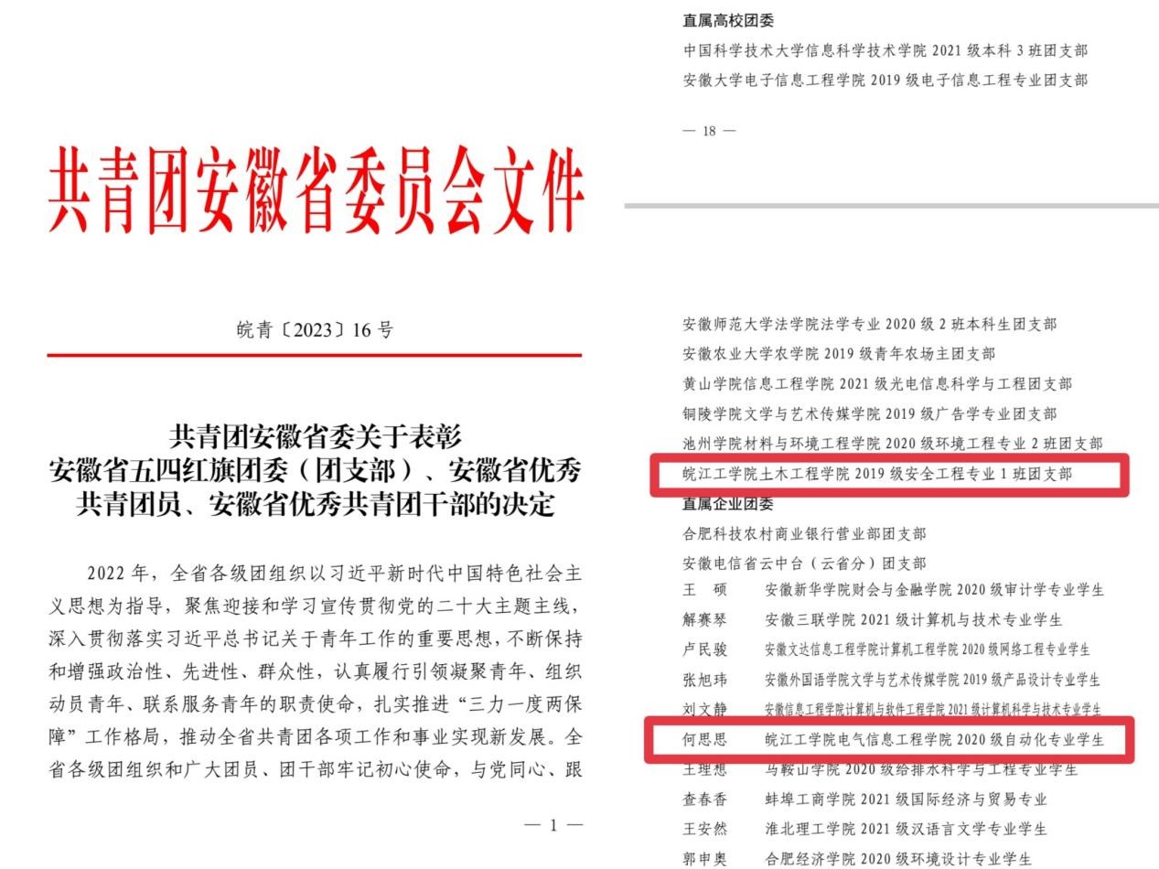 为表彰先进、树立典型,激励全省广大团组织和团员、团干部踔厉奋发、创先争优,5月3日,共青团安徽省委决定,集中表彰一批团学组织先进集体、优秀个人。今年会土木工程学院2019级安全工程专业1班团支部荣获2022年度“安徽省五四红旗团(总)支部”、今年会电气信息工程学院2020级自动化专业1班学生何思思荣获“安徽省优秀共青团员”称号。