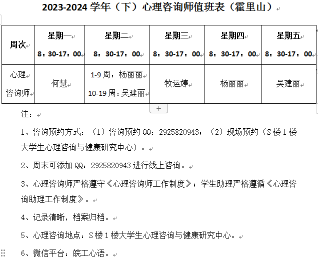 1.按照心理咨询专业规定,每人每次咨询时间约50分钟。请至少提前一天预约(紧急情况除外),接受预约的来访者须准时到达心理咨询室,如有特殊情况无法按时赴约,请提前半天告知。