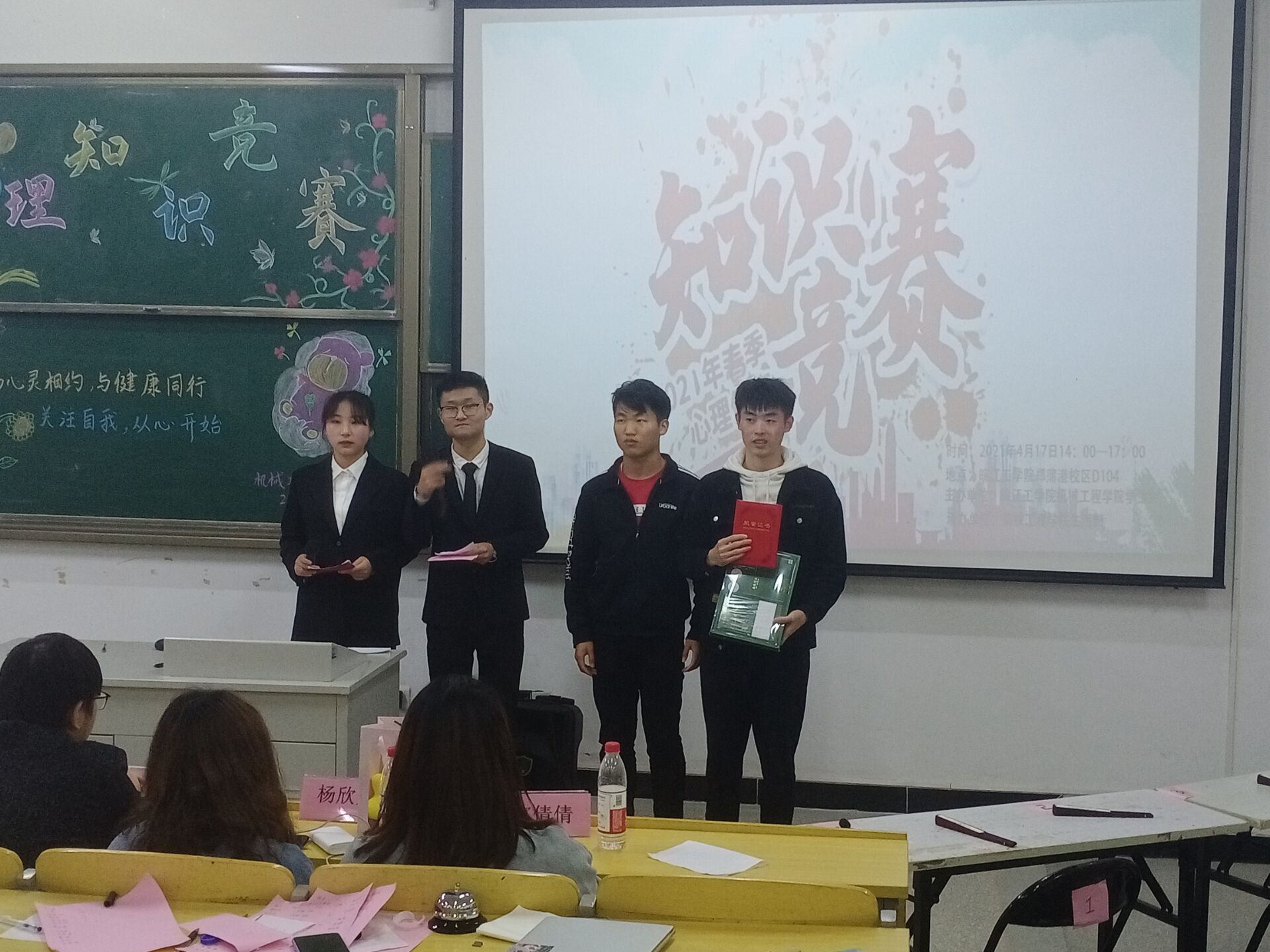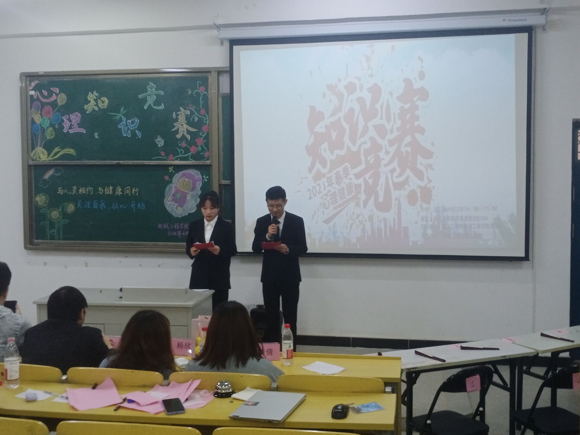 与心灵相约,与健康同行,关注自我,从“心”开始。2021年4月17日下午两点,生活部主办的心理知识竞赛于郑蒲港教室D104成功举行,并于四点三十分圆满结束。莅临本次比赛的评委有机械工程学院学生会主席张良辰,机械工程学院学生会主席代俊男,机械工程学院学习部副部长刘俊辉,宣传部副部长宫倩倩,文体部副部长杨欣月,外联部副部长方琛,生活部副部长高杰。同时到场的还有20级机械工程学院热爱心理知识的同学们。