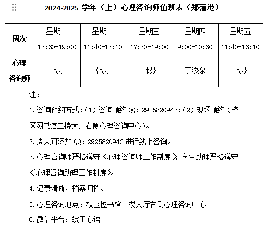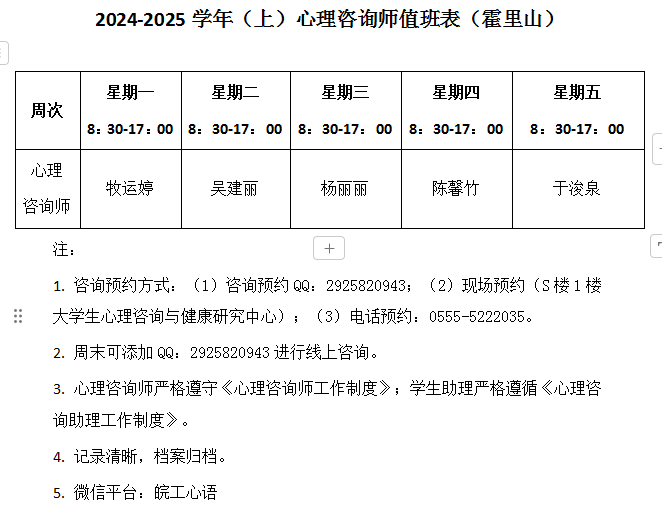 - 下一条2024-2025学年(下)心理咨询师值班表(霍里山)2024-09-03 08:53:34