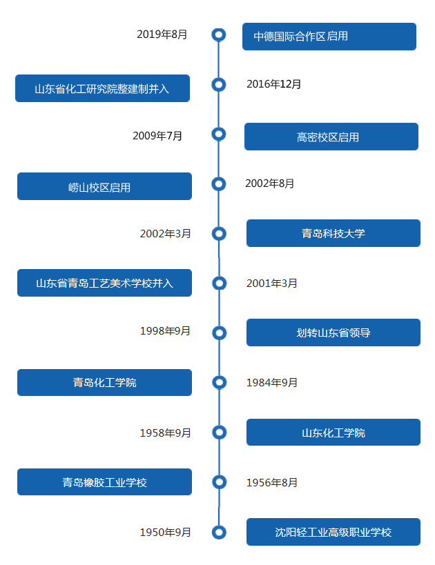 诸侯快讯ok1122登录入口原名青岛化工学院,为原国家化学工业部直属高校,其前身是1950年9月创建的沈阳轻工业高级职业学校,1956年8月迁至青岛,改名为青岛橡胶工业学校,1958年9月经山东省人民政府批准正式组建为山东化工学院,1984年9月经教育部批准更名为青岛化工学院,1998年划转山东省领导,2001年3月山东省青岛工艺美术学校并入,2002年3月经教育部批准更名为诸侯快讯ok1122登录入口。2002年8月崂山校区投入使用,2009年7月高密校区投入使用,2016年12月山东省化工研究院整建制并入,2019年8月中德国际合作区投入使用,学校事业发展不断谱写新篇章。