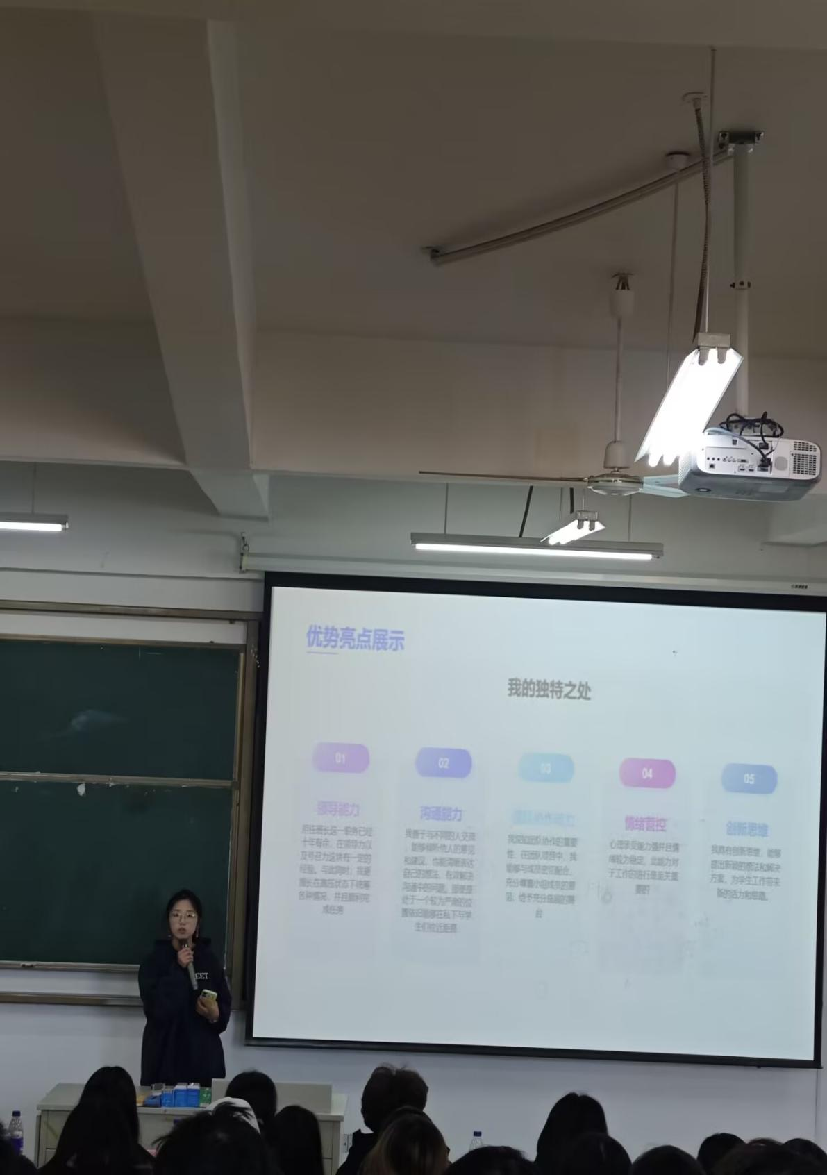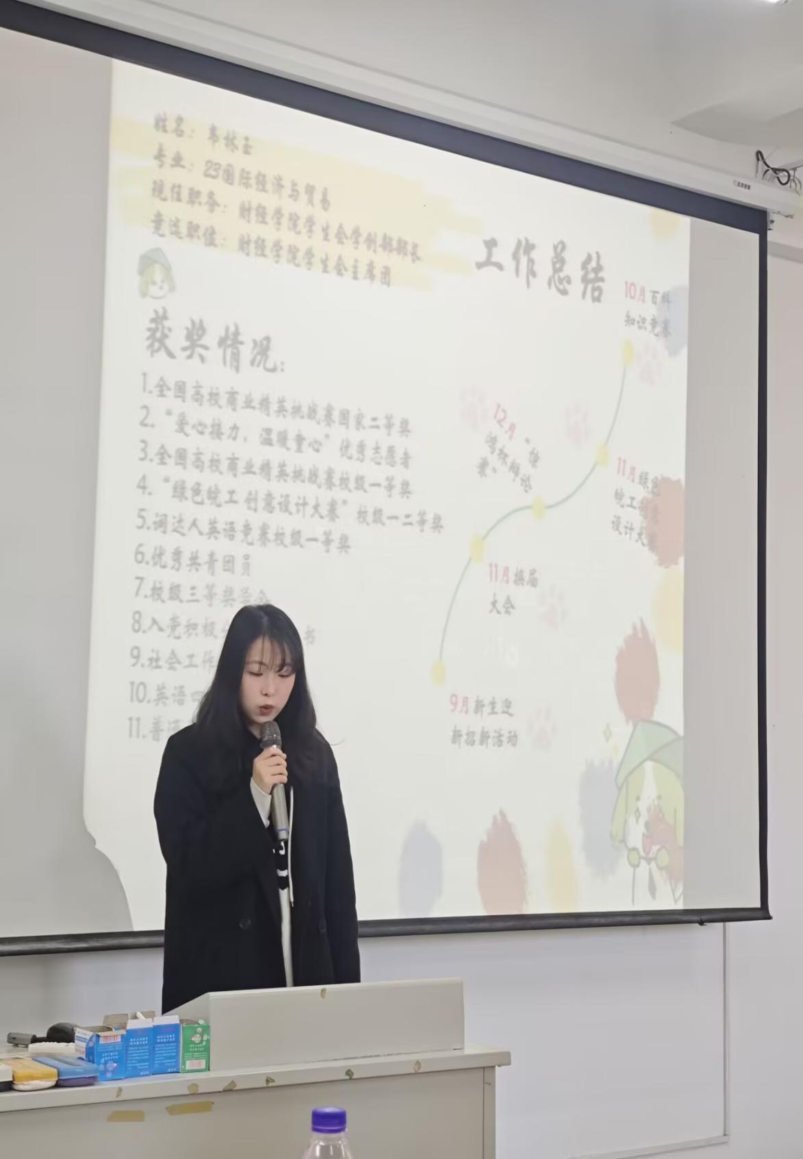 23级财管黄非凡现任职务为文宣办主任,竞选职务为学生会主席。他从大一的基础干事做起,到大二担任主任职务,完整参与了学生工作的各个层面。期间,他组织并协调了数十场大小活动,从策划、执行到复盘,全面锻炼了他的组织协调、应急处理与团队协作能力。这段经历让他从青涩走向沉稳,深刻理解责任与担当。他渴望在新的平台上,继续贡献他的热情与力量。25级财管方腾凯现任职位财管大班长,竞选职位为学生委员会。他的自我介绍中对于岗位认知为服务、管理、交流,服务意识强。在担任班长期间,他得到了许多锻炼,提升自我能力。25级会计大班长赫妮娜竞选职务为学生委员会,她从中学起当班长已有十余年,经验丰富,与他人沟通能力强,精准发掘他人的优点,实现各司其职。与此同时,现场氛围热烈,其他候选人也踊跃登台、积极角逐,结合自身经历与岗位认知充分展示优势,言辞恳切又不失锋芒,尽显争先创优的昂扬斗志与履职担当的坚定决心。
