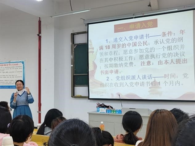 张高桢结合中国共产党党史以及发展学生党员的相关规定,紧紧围绕着中国共产党是一个什么样的政党、我们为什么要加入中国共产党、我们怎样才能加入中国共产党三方面为同学们展开全面且详细的介绍。张高桢强调端正入党动机的重要性和必要性,希望同学们结合所学专业和自身实际不断深化对中国共产党的认识,积极向党组织靠拢。