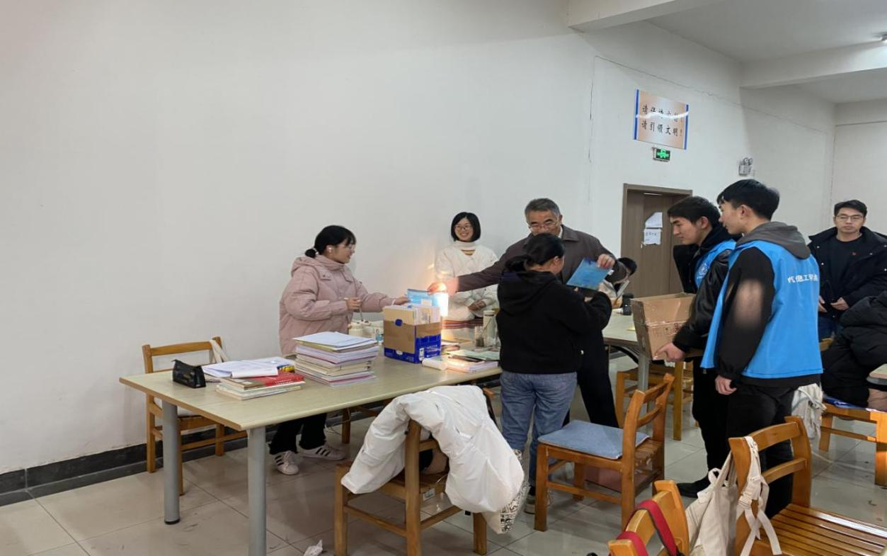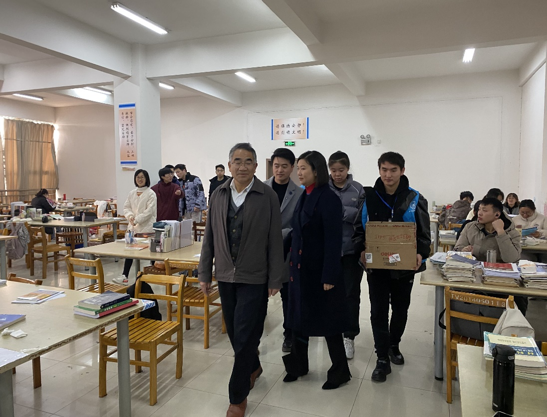 12月23日上午,12月23日上午,为进一步落实“立德树人”的根本教育任务,崇尚学习追求卓越,大力提升人才培养质量,电气信息工程学院在前期服务的基础上又在学校图书馆开展“考研送温暖”主题活动。党总支书记杨安胜,副书记马羽佳,学工办副主任孙伟及毕业班辅导员老师一同慰问正在备战考研的学子们。