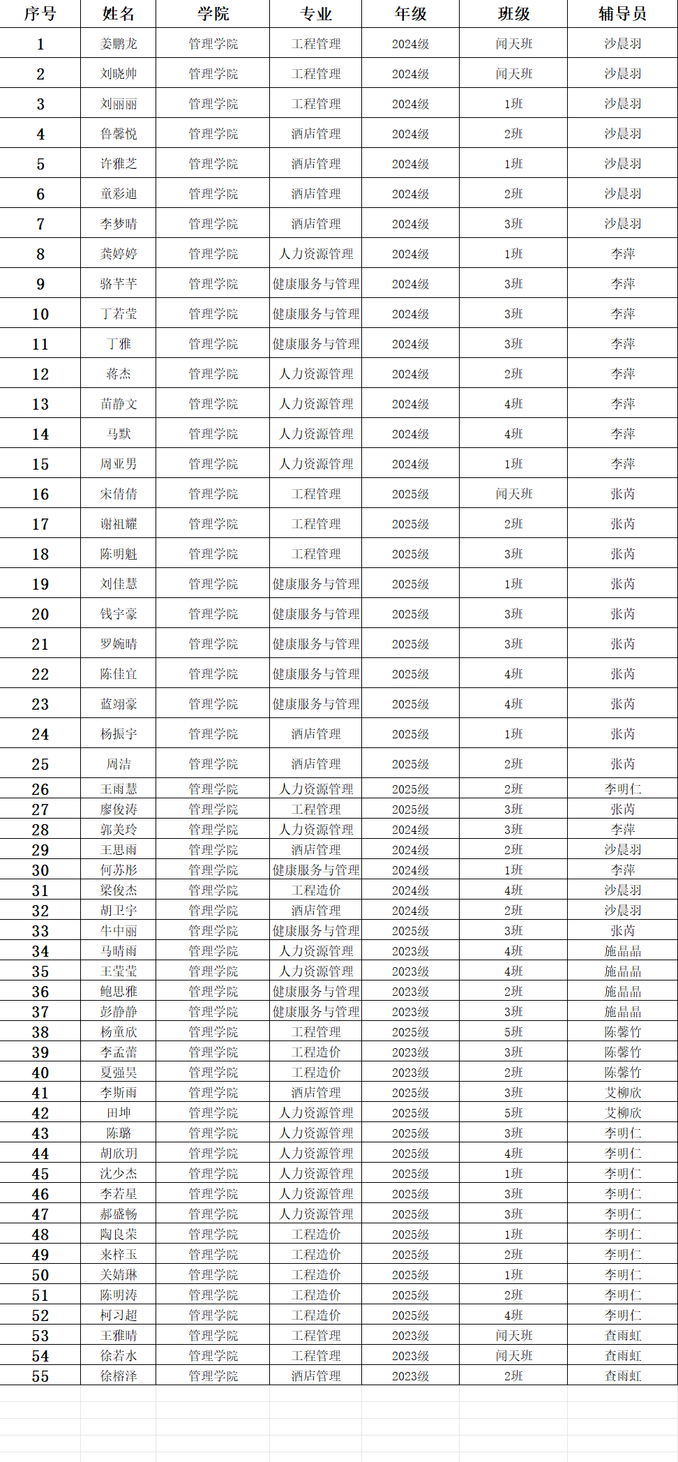 根据《中国共产主义青年团发展团员工作细则》,经学生自主申请、团支部推荐、学院团委培训考核,现确定以下55名同学为今年会jinnianhuicom管理学院2025-2026学年第一学期共青团员,特此公示: