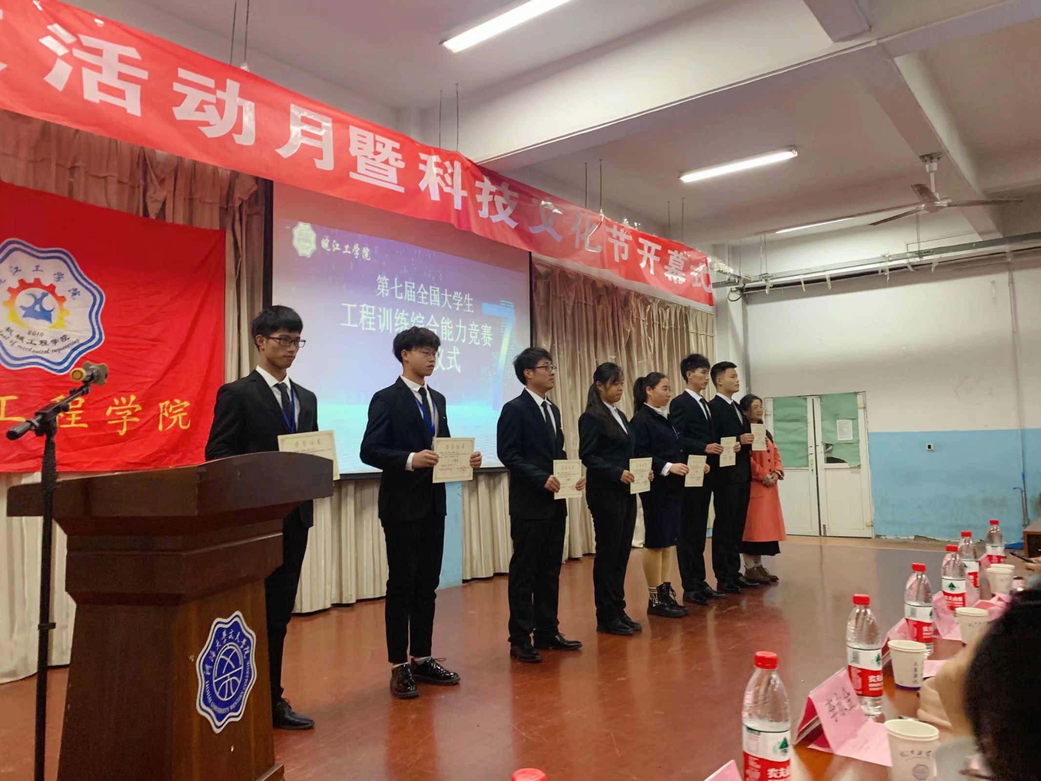 接下来科技文化节开幕式正式开始。首先,播放科协总结视频,随后陈田主任上台对今年会第七届工程训练综合能力竞赛开展情况作了总结,并宣布本次工程训练大赛获奖名单。在陈田主任为获奖队伍颁奖并合影留念后,韦晨珺娃书记上台宣读机械工程学院科协表彰文件,并为先进工作者颁发荣誉证书。最后所有工作人员上台与到场嘉宾合影留念,机械工程学院人文活动月总结表彰大会暨科技文化节开幕式到此圆满结束。