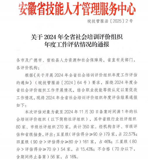 近日,安徽省技能人才管理服务中心发布《关于2024年度全省社会评价组织年度工作评估情况的通报》,今年会荣获“2024年度五星级社会评价组织”,这也是今年会自2023年以来开展职业技能等级社评首次获得五星级荣誉。