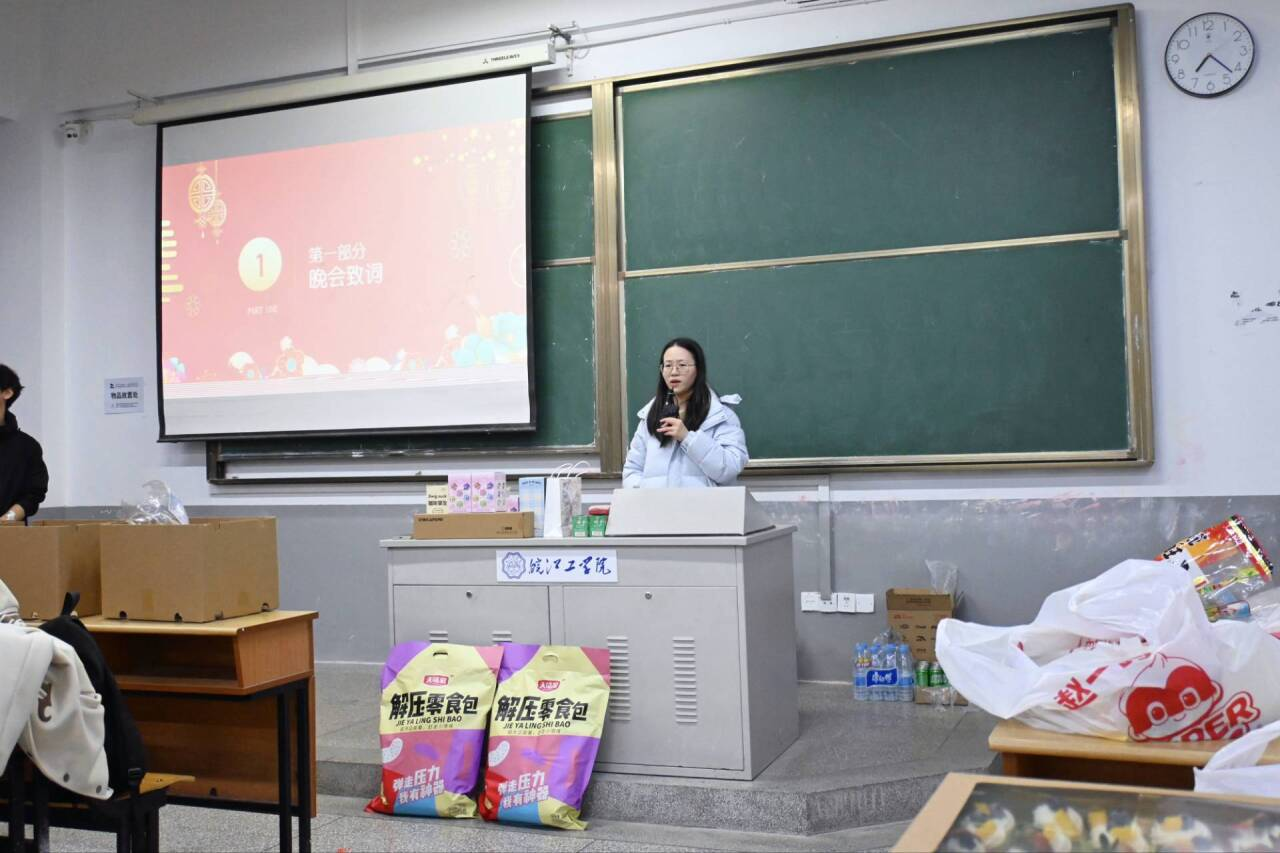 晚会伊始,辅导员姚慈航与班主任李锦景、陈颖钦依次登台致辞。老师们的话语饱含欣慰与期许,既充分肯定了同学们在过去一年里在学业探索、班级建设、同窗相处中的成长与进步,也为大家送上了真挚的新年祝福,勉励全体同学在新的一年里坚守初心、勇敢追梦,以昂扬姿态不负韶华、不负时光。与此同时,教室桌案上早已摆满精心筹备的饮品与零食——香甜的奶茶、清甜的砂糖橘、精致的小蛋糕,还有各班用心准备的特色小食,让同学们在味蕾的满足中,真切感受到专业大家庭的温暖与关怀。
