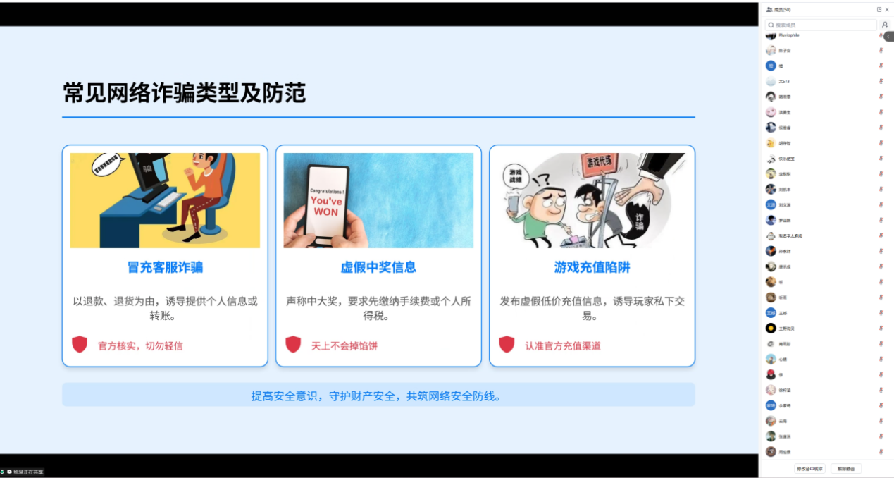 网络安全环节中,鲍慧老师重点剖析三类高发诈骗形式:冒充客服退款诱导转账、虚假中奖信息索要费用、游戏代充代练陷阱。她提醒同学们不扫陌生二维码、不泄露身份证号等敏感信息、不与陌生网友单独见面,守护个人信息和财产安全。最后,在用电安全方面,鲍老师强调离校前务必关闭宿舍总电闸、切断所有电源,从源头防范电器老化、电压过载引发的火灾风险,筑牢校园用电安全防线。
