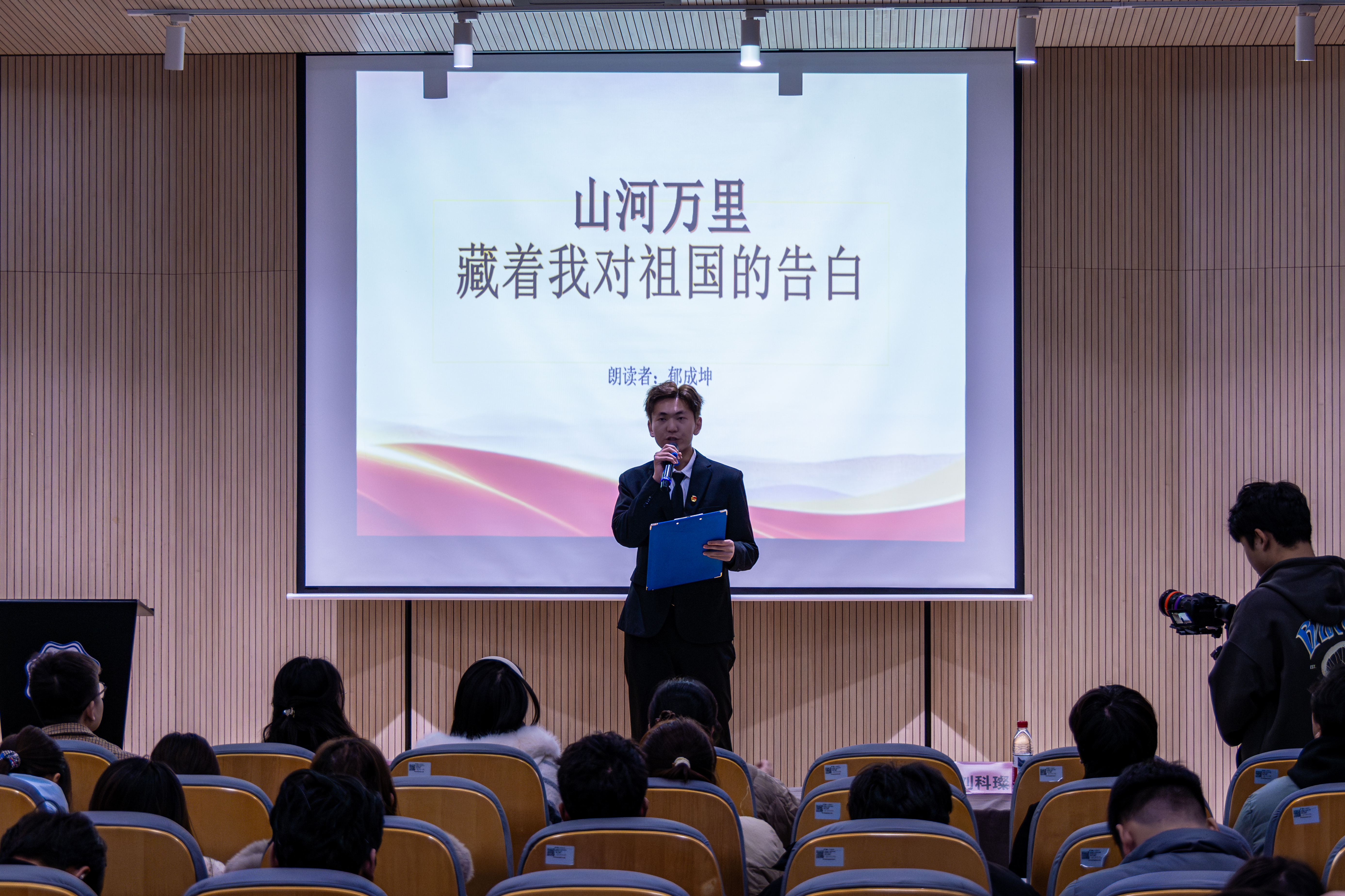 报告厅内气氛庄重而热烈。十五位诵读者依次登台,以饱满的激情诠释了红色经典的时代内涵。他们或慷慨陈词,再现革命先辈的铮铮誓言;或深情诉说,抒发对祖国母亲的赤子情怀。在动人旋律中,朗诵声与音乐交融,将个人理想融入时代主题,展现出青年一代“强国有我”的使命担当,现场氛围热烈,掌声不断。