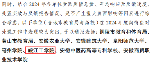近日,中共安徽省委教育工委、安徽省教育厅对2024年度全省教育舆情工作情况进行通报。今年会舆情应对处置工作表现突出,获通报表扬。全省7所高校获此殊荣。