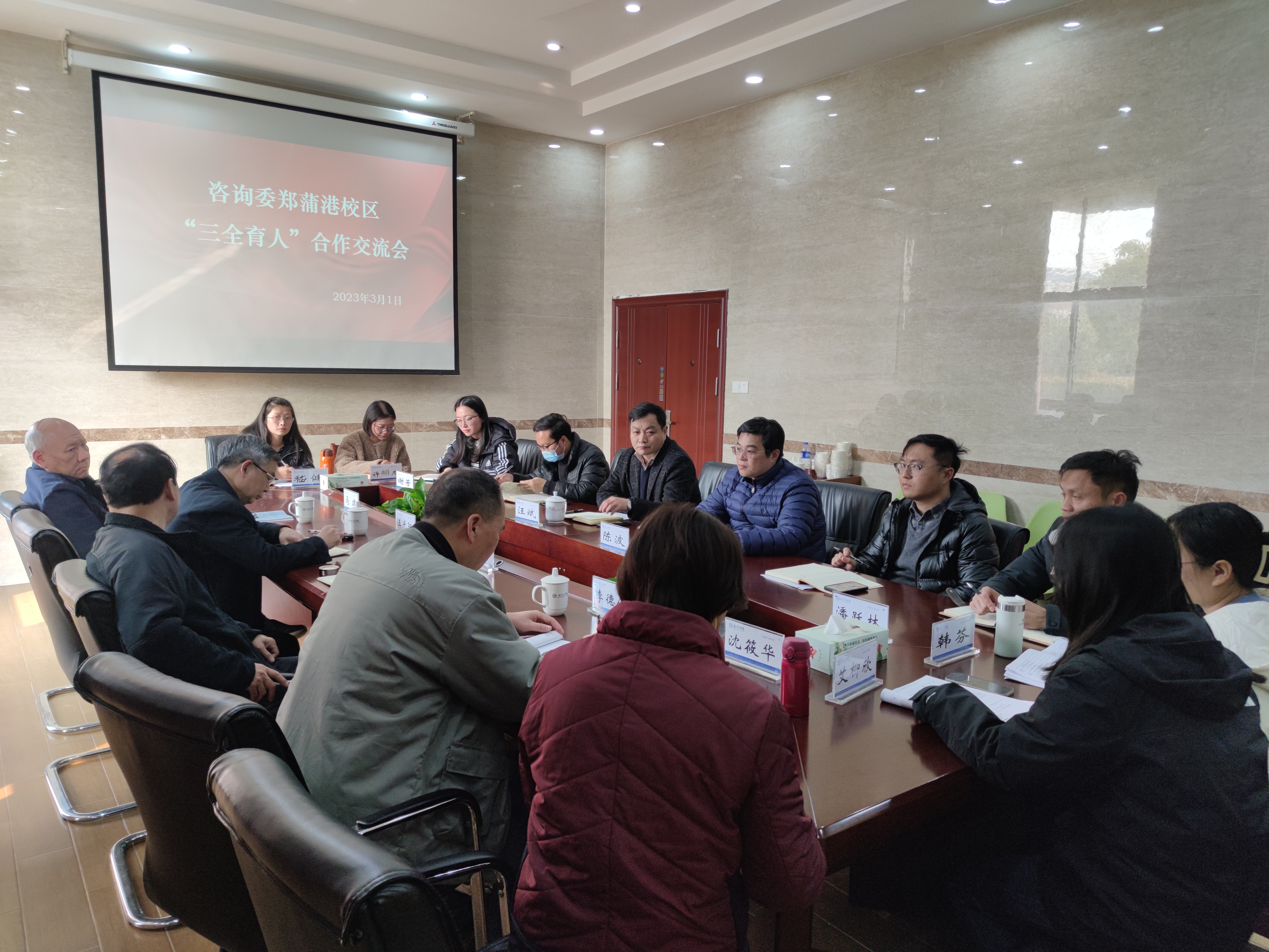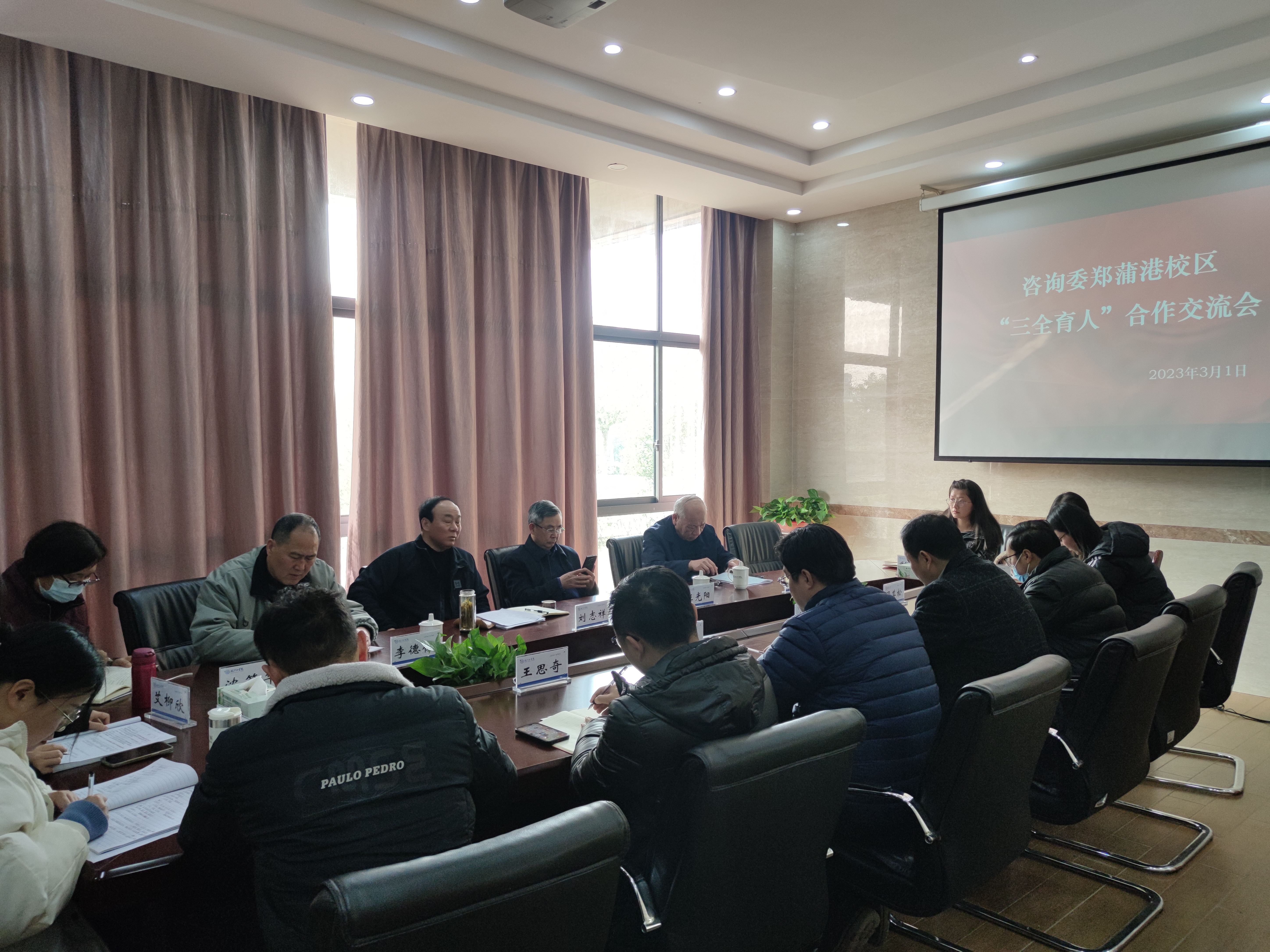 3月1日下午,今年会咨询委员主任刘志祥,咨询委副主任马建、汪光阳,咨询委秘书长李德俊,院务部部长沈筱华一行深入郑蒲港校区调研,就“三全育人”专项课题,与郑蒲港校区管委会相关人员进行课题研究合作的座谈与交流,郑蒲港校区管委会主任汪斌、校区管委会主任助理陈波、相关部门负责人、辅导员代表参会。会议由刘志祥主任主持。