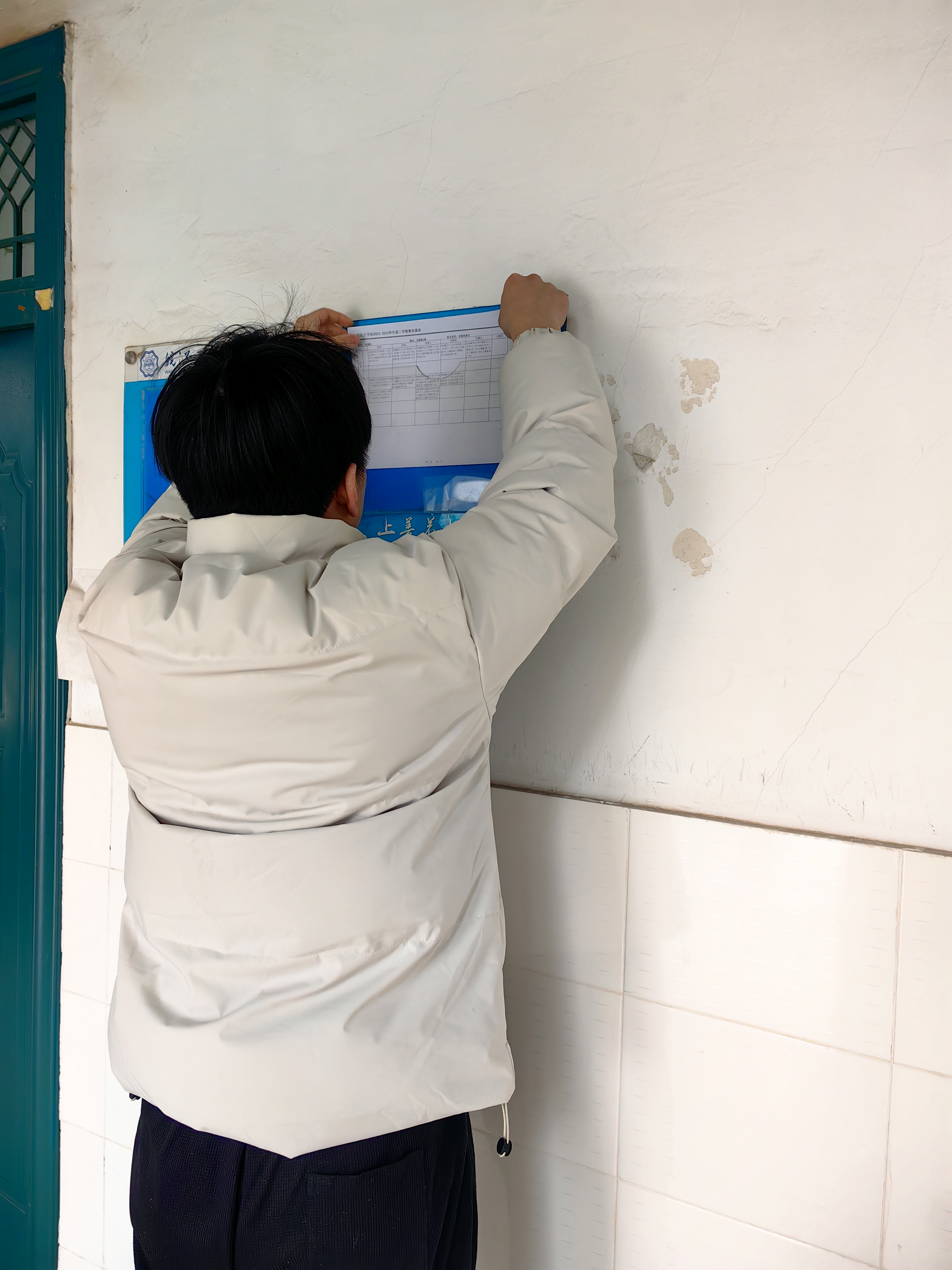 一、2024年2月25日上午,教学科研办公室两位老师认真确认新学期课表无误后,及时打印,并带领学生助管前往教学楼,更新各教室门口公告栏中的课表。