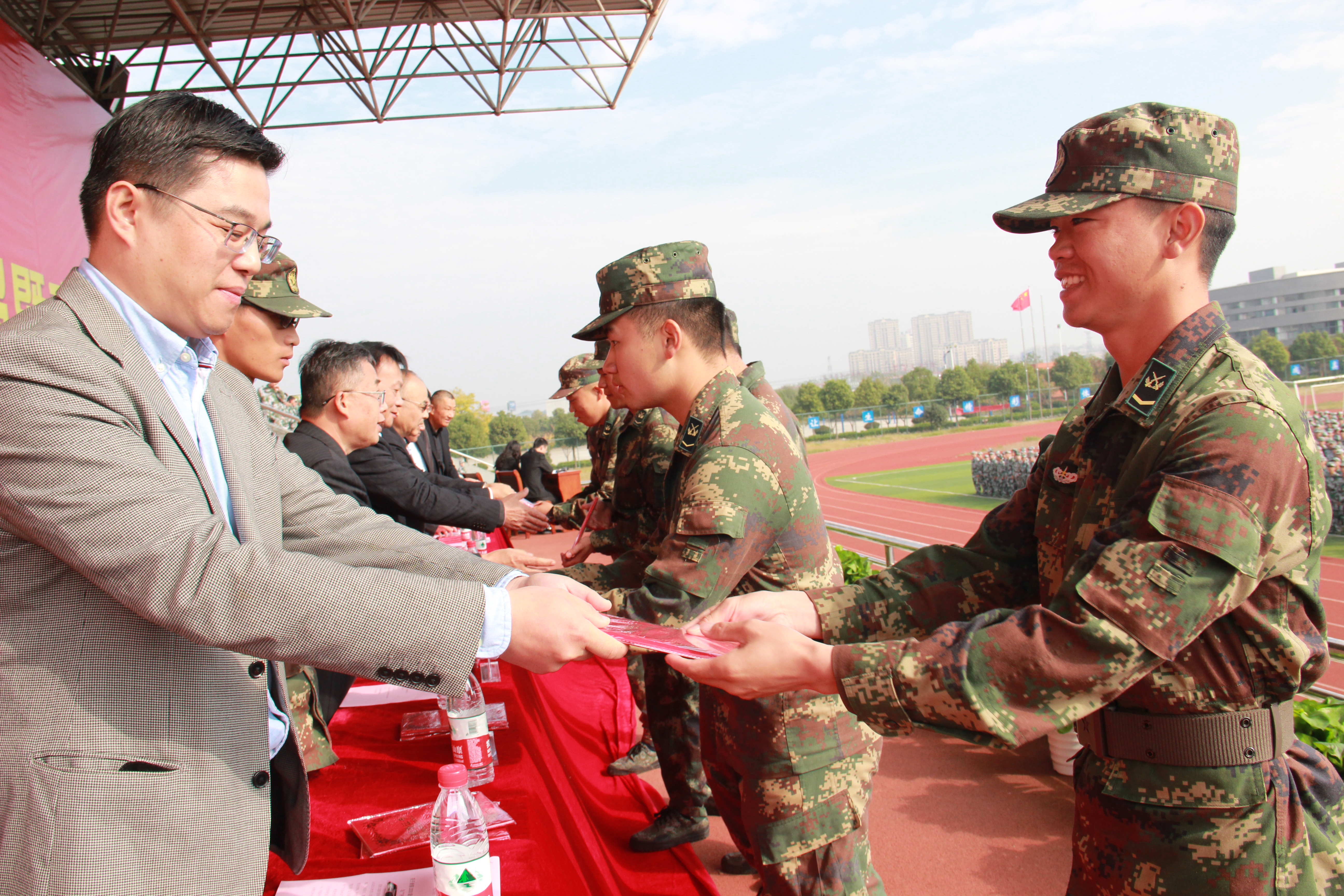 随后,郑蒲港校区管委会主任助理陈波宣读表彰决定,出席台领导分别为“优秀带训教官”、“优秀军训工作者”、“军训积极分子”、“军训内务标兵”称号的个人和集体颁发荣誉证书。