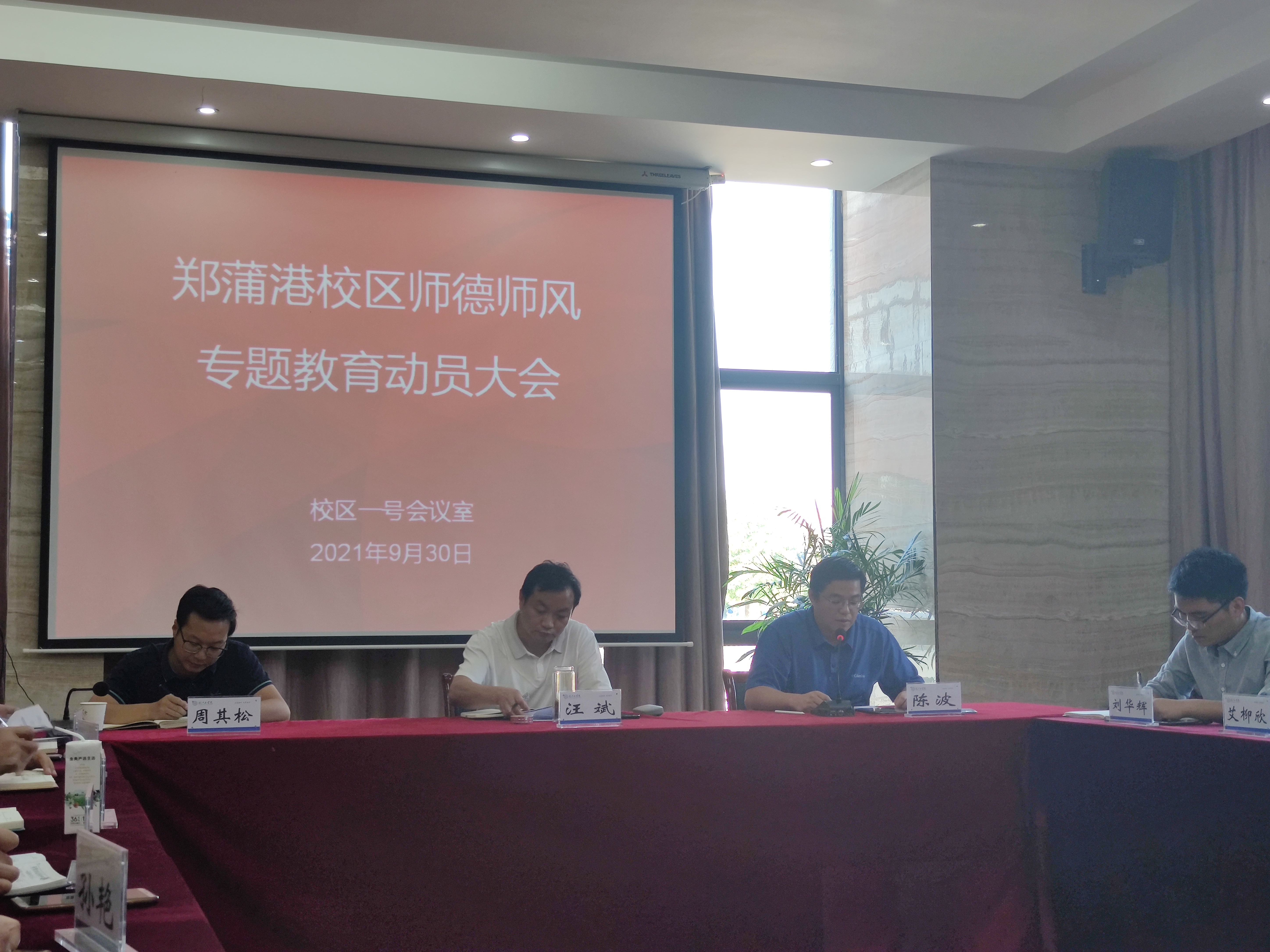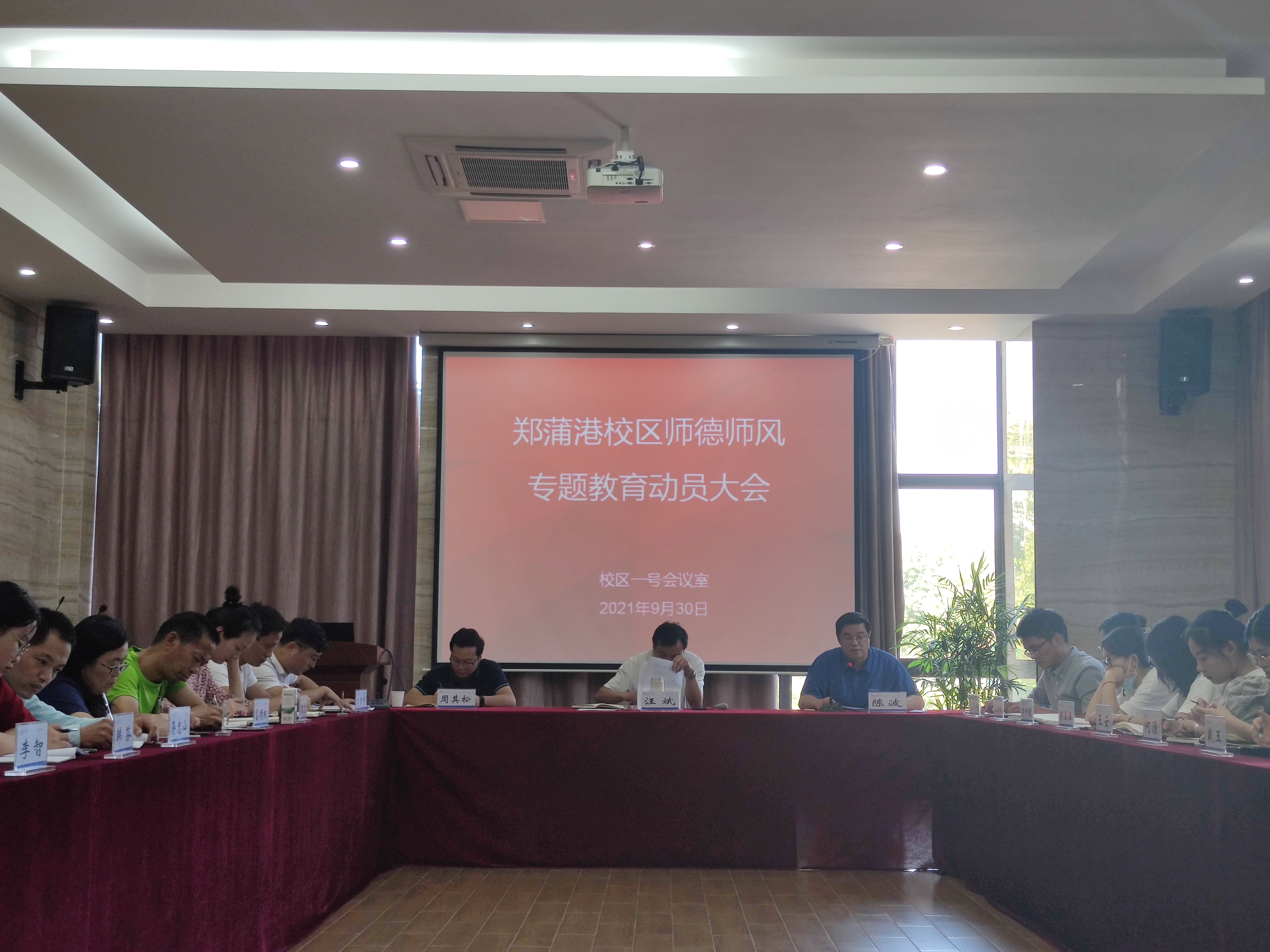9月30日下午,郑蒲港校区在行政楼一楼会议室召开校区师德师风专题教育动员大会。校区管委会主任汪斌及校区全体教职工参会,会议由校区管委会主任助理陈波主持。