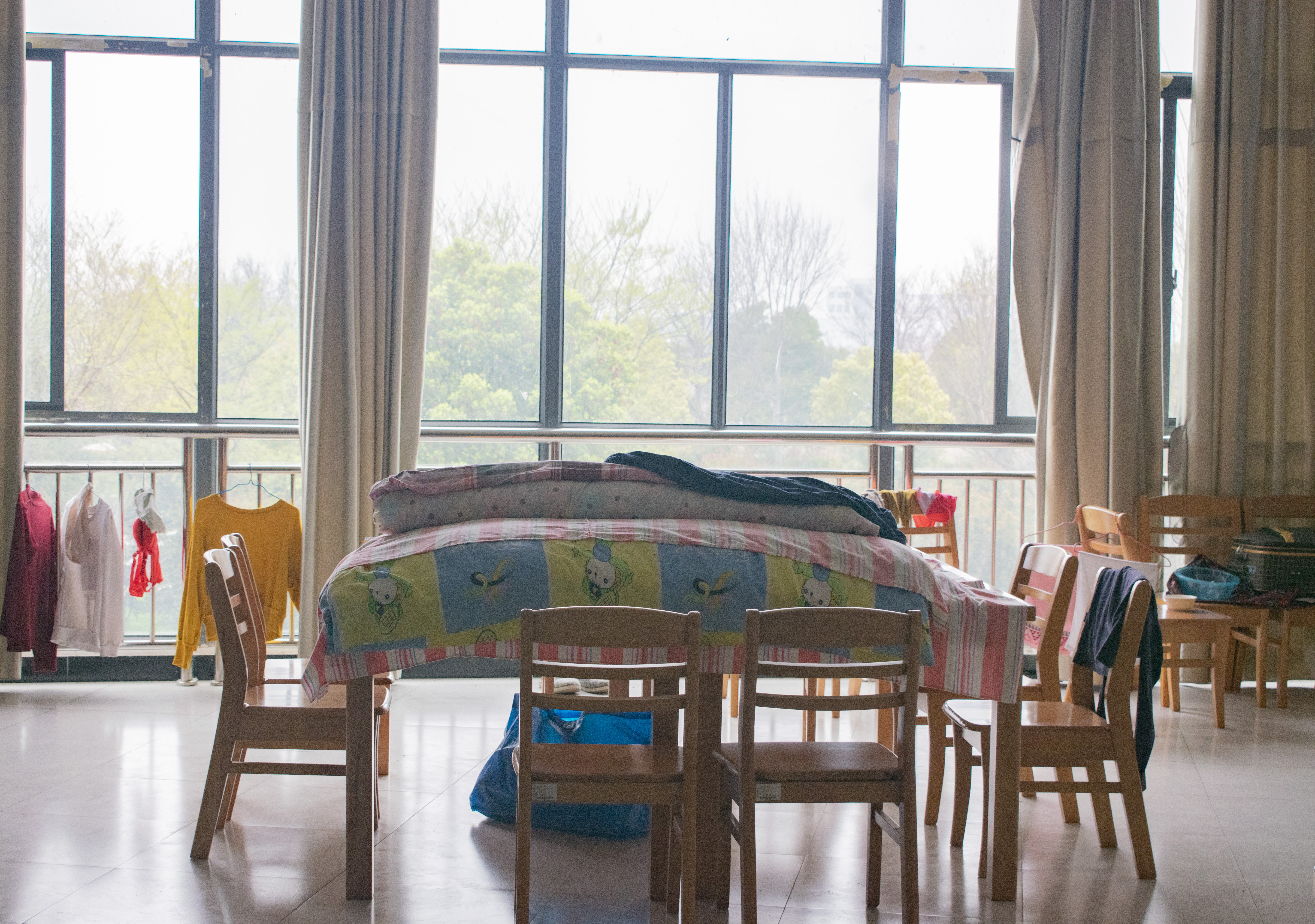 校区全封闭式管理期间,有宿管、保洁、食堂、超市等146名后勤工作人员坚守住校,保障校区全体师生正常生活。由于床位紧张,特将图书馆自习室改为后勤员工临时住宿点。