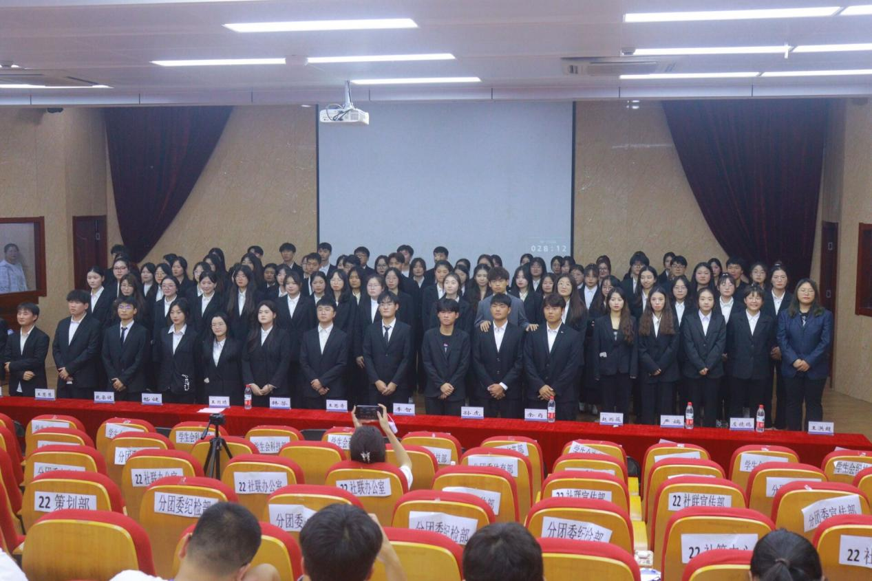 2023年10月25日晚七点,郑蒲港校区第九届学生组织(校区分团委、学生社团联合会)换届大会于图书馆一楼报告厅圆满结束。本次换届大会由韩昕怡主持,参加本次换届大会的领导和老师主要有郑蒲港校区学工办主任王思奇老师、学工办副主任韩芬老师、综合办副主任李智老师、分团委书记王雨晴老师以及22、23级各学院辅导员。此外,本次换届大会也有幸邀请第八届学生组织干部以及23届新干事。