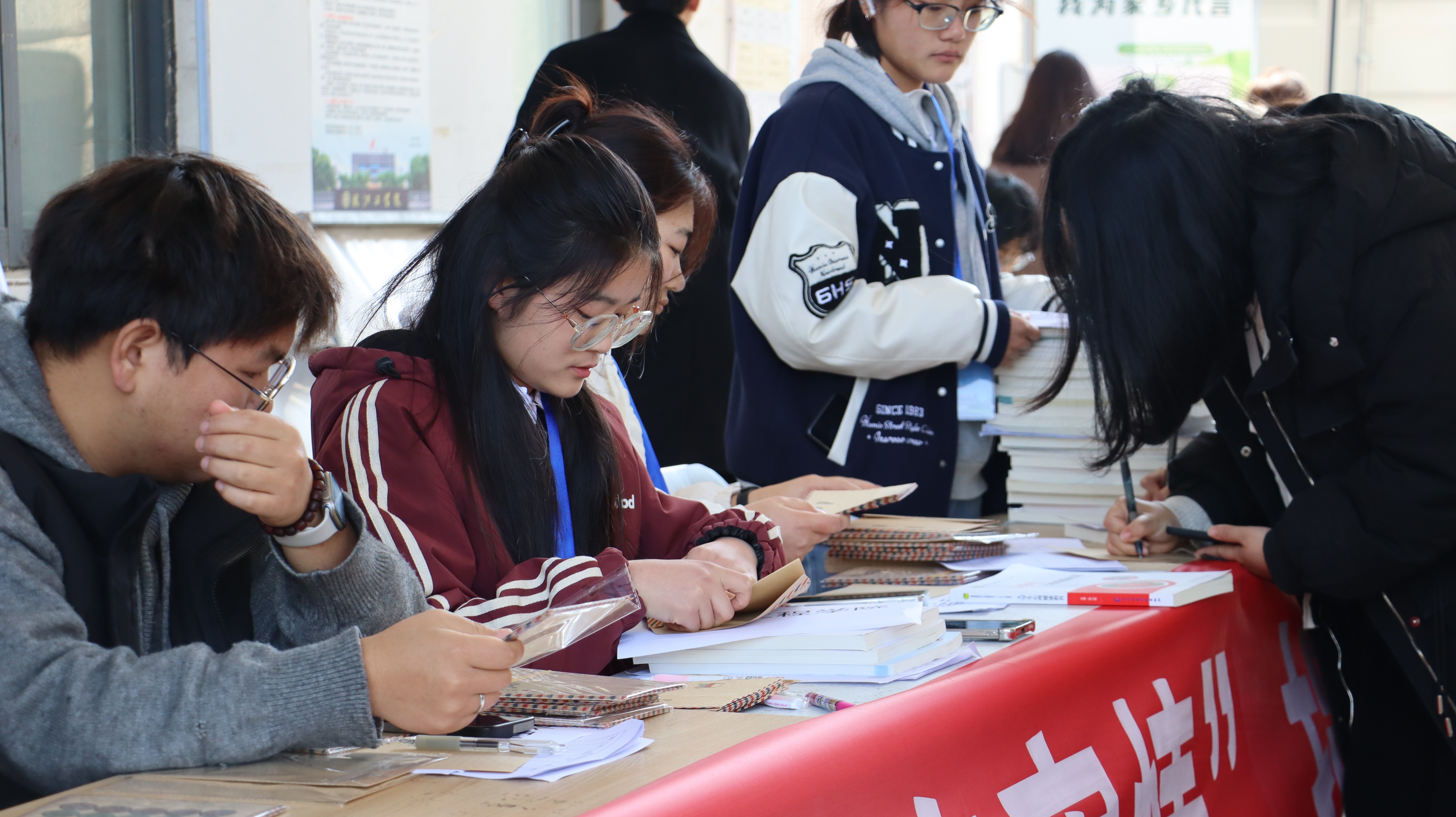 活动当日,同学们积极响应号召,带着闲置书籍来到现场。从文学名著到热门小说,一本本带着主人温度的书被整齐摆放。工作人员有条不紊地初步筛选书籍,仔细甄别内容质量,确保每本参与流转的书籍都能为新读者带来价值。在确认符合捐赠要求后,为每本捐书贴上专属标签,登记书名、作者、捐书人姓名及联系方式等信息,方便后续流转与交流 。活动的互动环节别出心裁,成了现场焦点。工作人员向捐书同学发放明信片,鼓励大家写下暖心寄语与联系方式夹在书中。不少同学精心构思,分享阅读感悟、送上祝福,为书籍注入鲜活情感。这些书籍承载双重意义,不仅传递知识,还有望让捐书人与受书人因书结缘。活动结束后统计,现场共收到数百本捐赠书籍。这些书籍将进一步整理,计划通过多种渠道再利用。部分运至校内领取点,供同学们按需挑选;部分则捐赠给有需要的社区、学校,将皖工学子的爱心与知识传播到更广阔的天地。